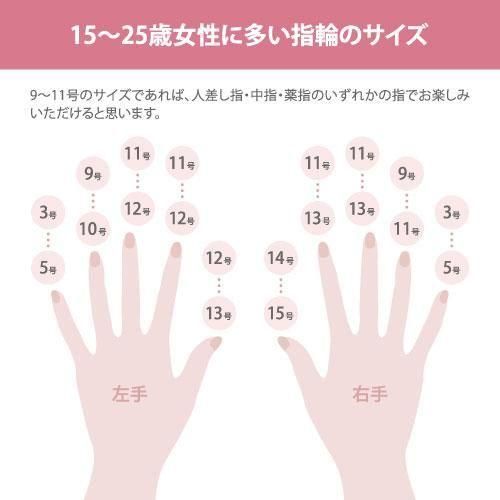 サイズも9号と11号が用意されており、10代から20代の女性に幅広く対応しています。人差し指、中指、薬指など、自分に合った指に合わせておしゃれを楽しめます。